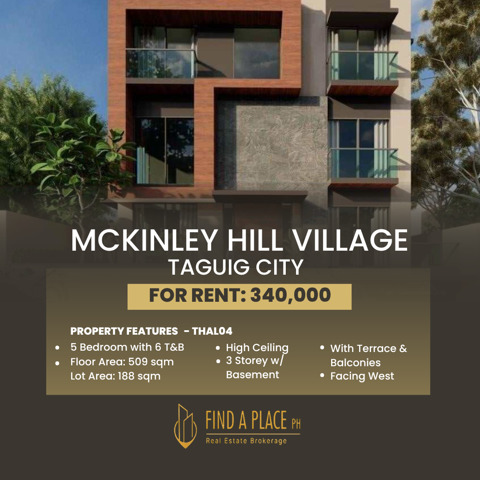 Code: THAL04 Property: Mckinley Hill Village Type: House & Lot Lot Area: 188 sqm Floor Area: 509 sqm Description: ❇️ 5 Bedroom with 6 T&B + Powder Room ❇️ 3 Storey with Basement ❇️ High Ceiling ❇️ With Balconies & Terrace ❇️ Facing West ❇️ 4 Car Garage